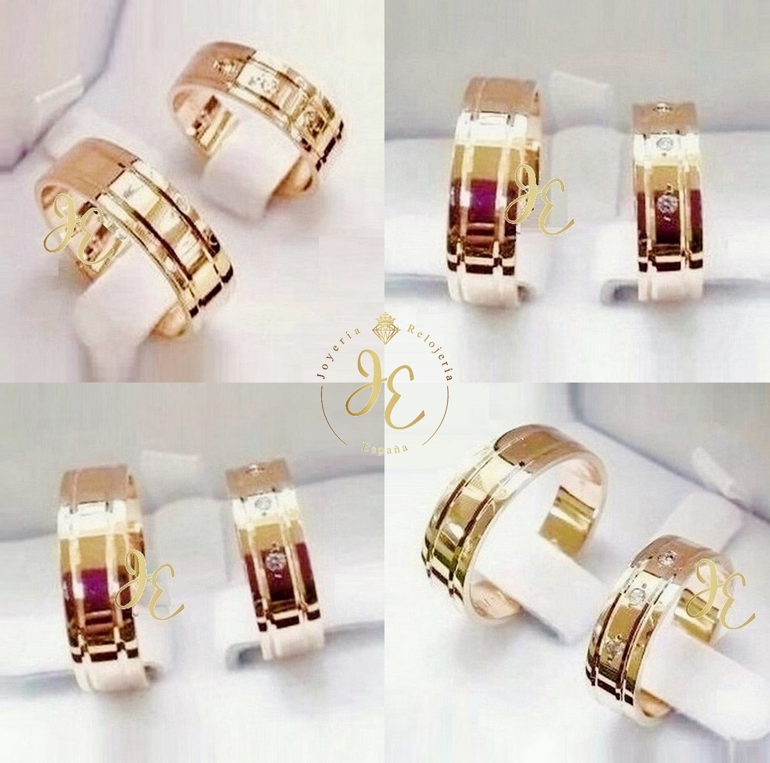 Aros De Matrimonio Elegante Modelo "Swirl" con Piedras Swarovski en oro clásico ley 18k legitimo está 4,910 soles.