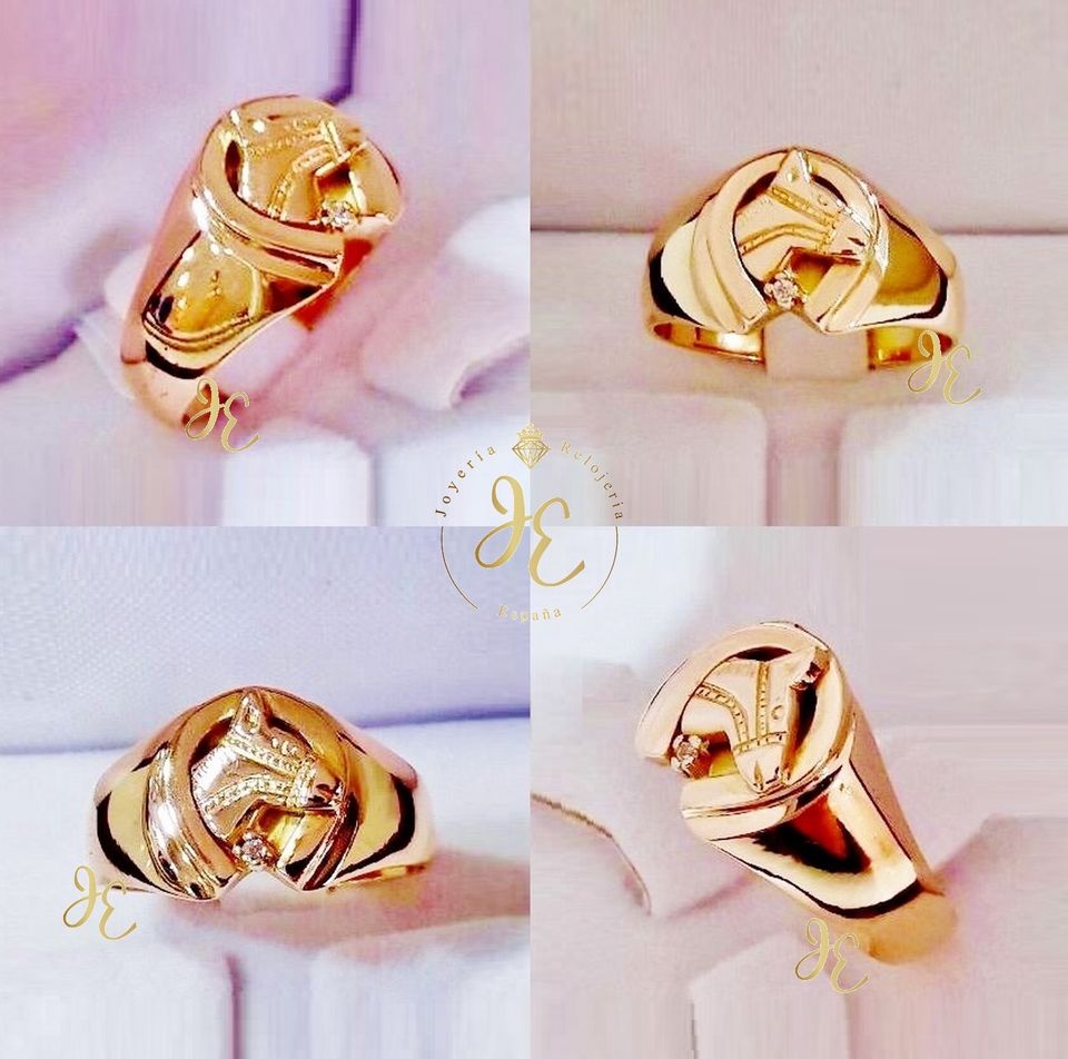 Anillo Elegante Modelo Herradura con silueta de caballo en alto relieve y Brillante Suizo Fino en oro ley 18k legitimo de 15 gr. aprox.