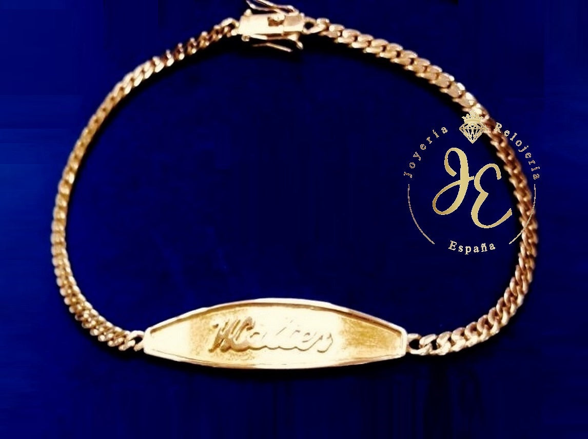 Esclava Elegante Modelo Lomo Corvina de 22 cm. con "Nombre Personalizado" en alto relieve en oro clásico ley 18k legítimo de 3.3 a 3.5 mm. aprox. de grosor.