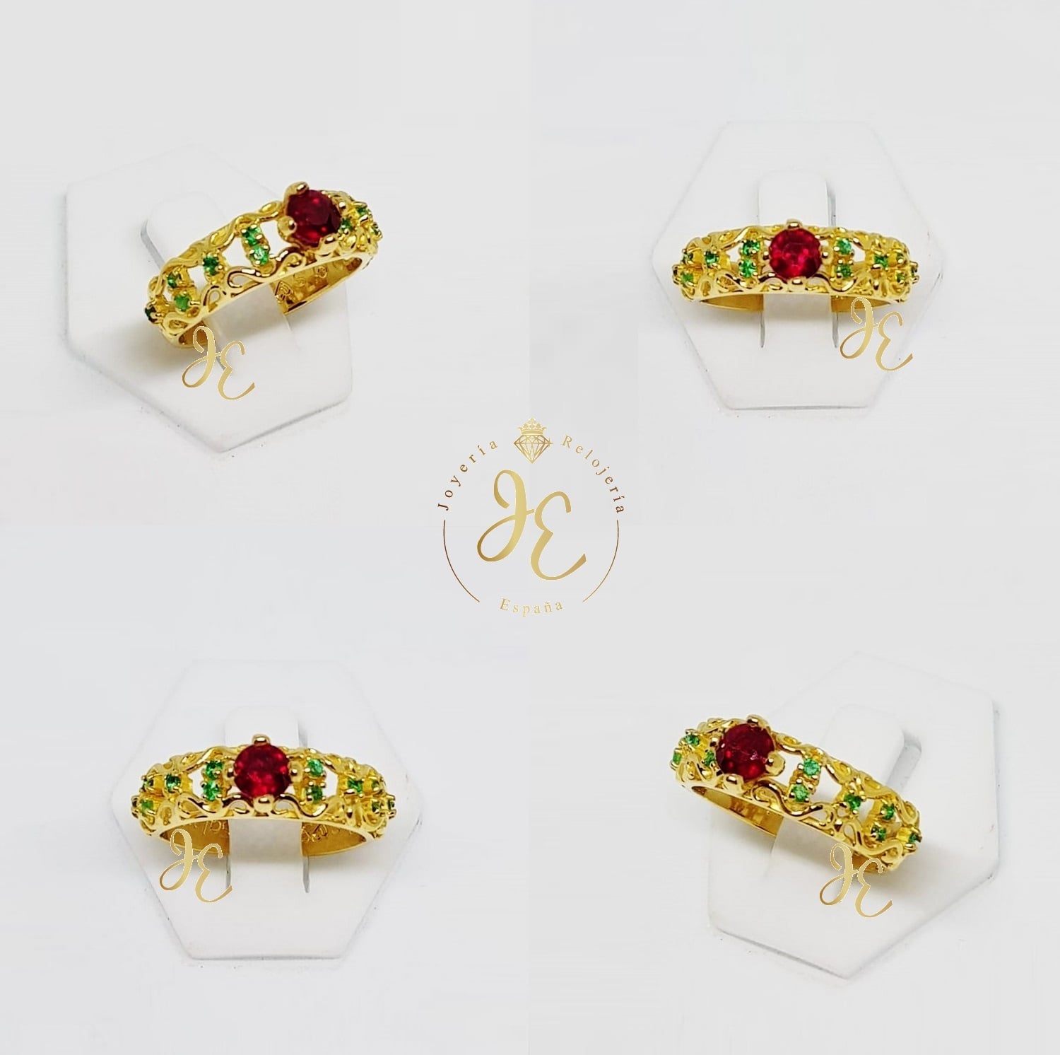 Sortija fina y elegante , con Rubí de 0.65 ct y Esmeraldas Originales en oro Amarillo Fino ley 21k está 1,410 dólares