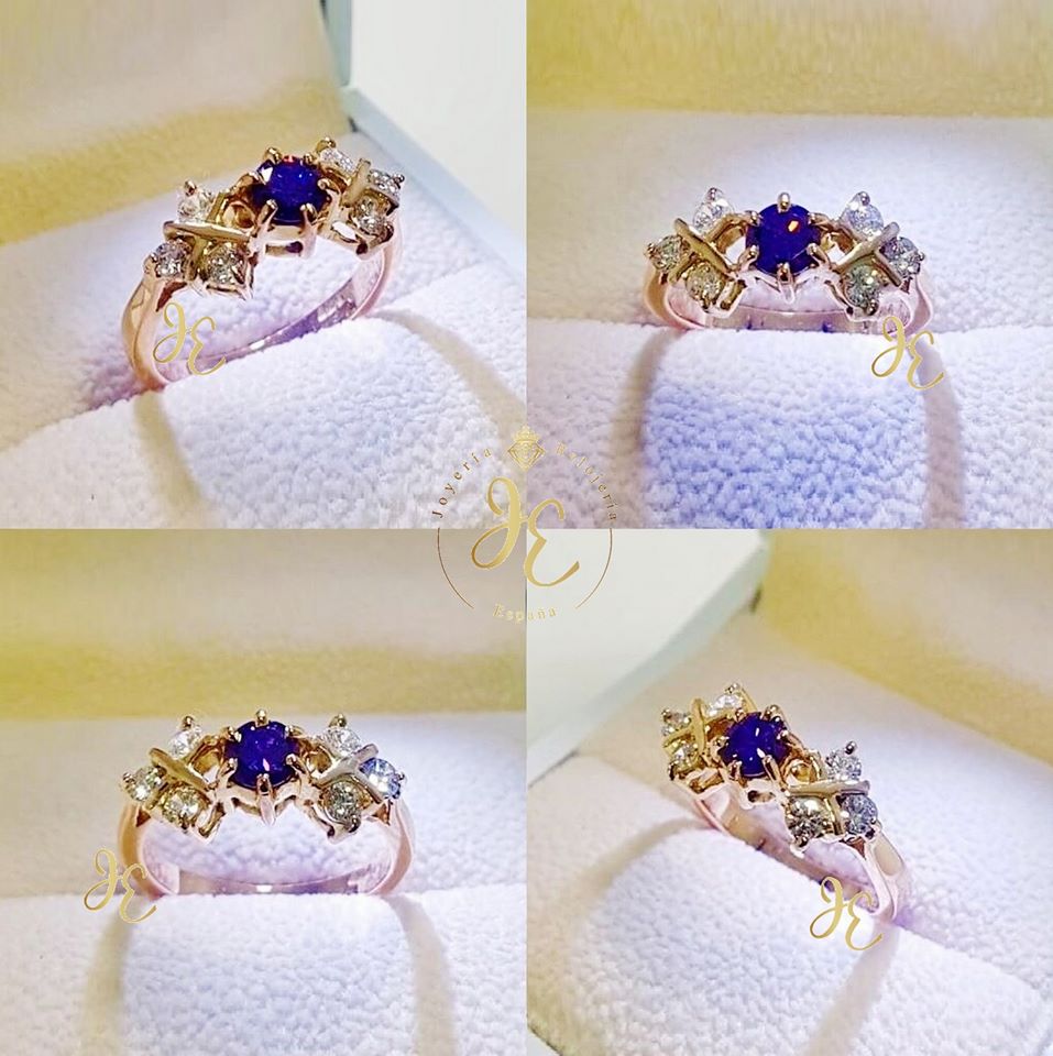 Sortija fina y elegante, con Amatista Fina y Brillantes Suizos Finos en oro clásico ley 18k legitimo.