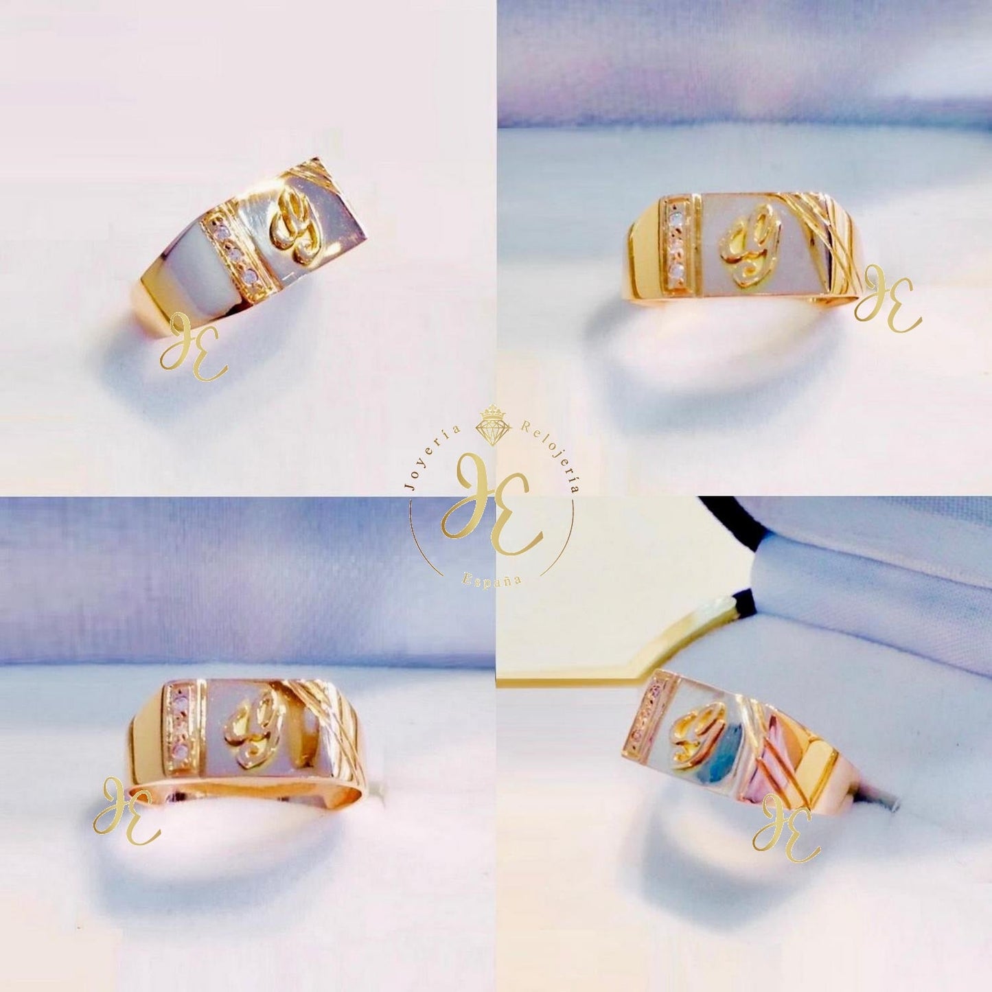 Sortija fina y elegante, Chevalier con 3 Brillantes Suizos Finos e Inicial Personalizada, en oro fino ley 21k