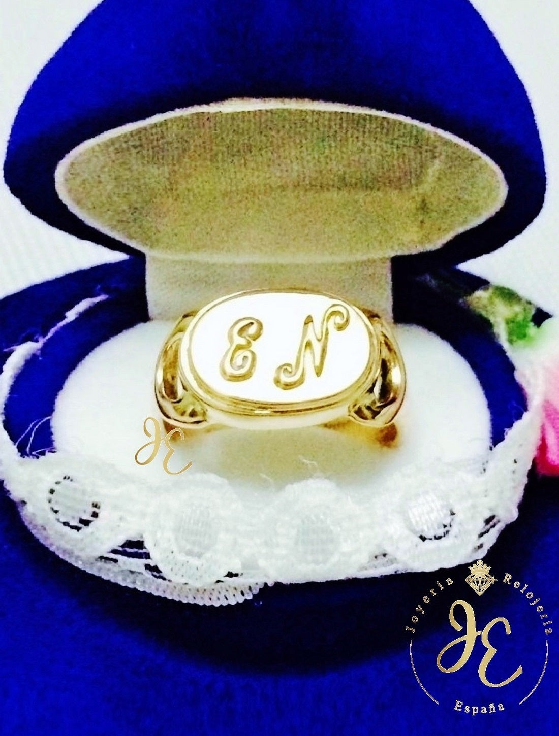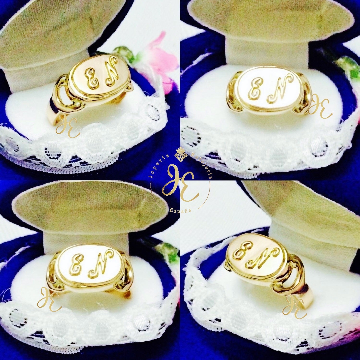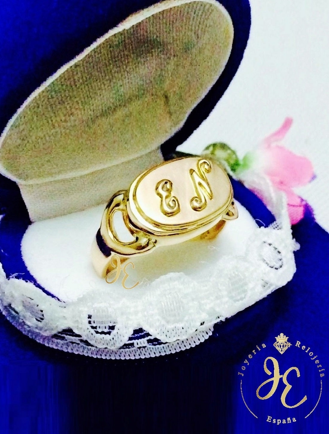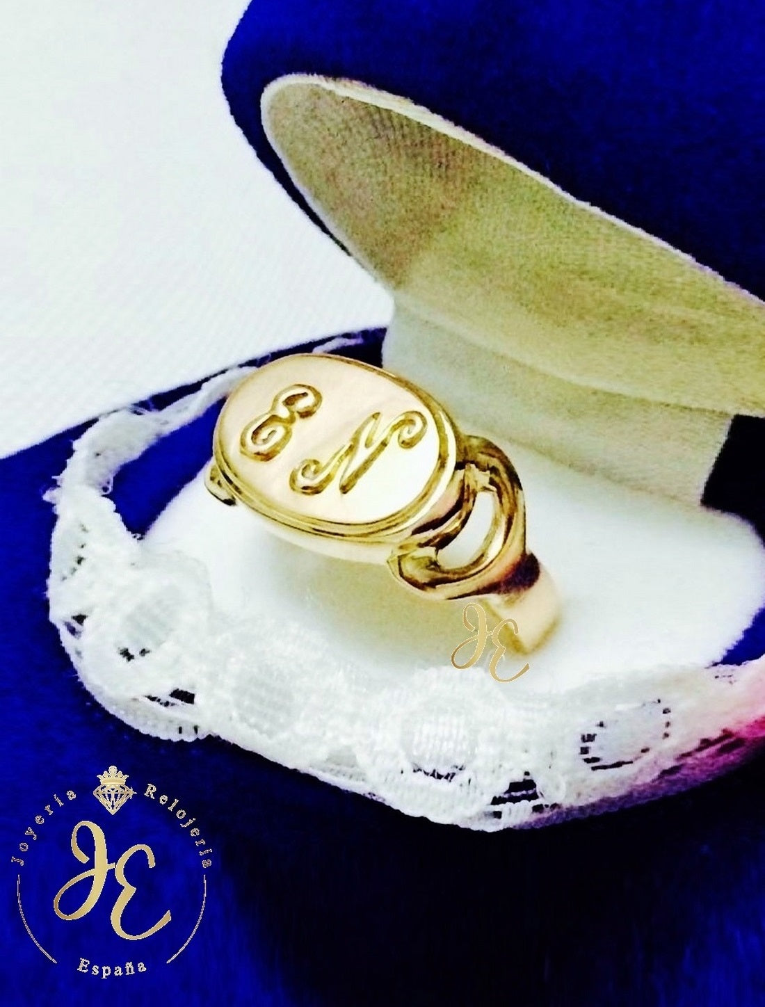 Sortija fina y elegante, Modelo Chevalier con Iniciales Personalizadas, en oro clásico ley 18k legitimo de 13 gr. aprox.