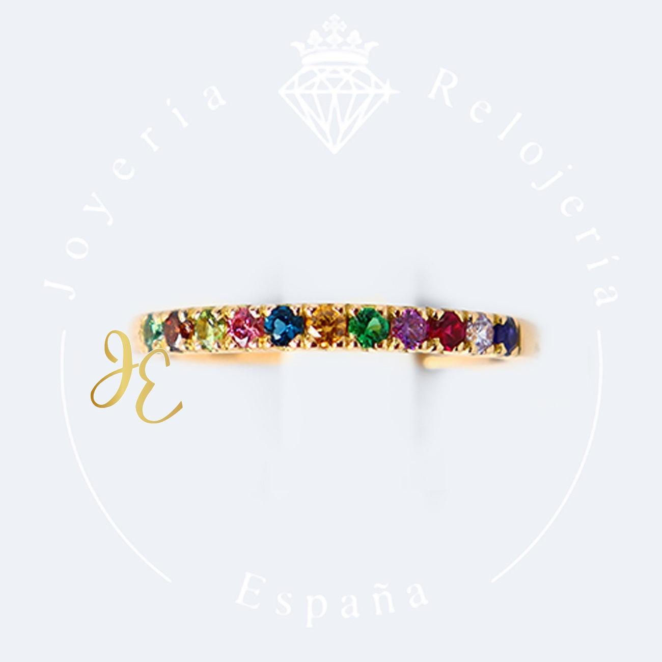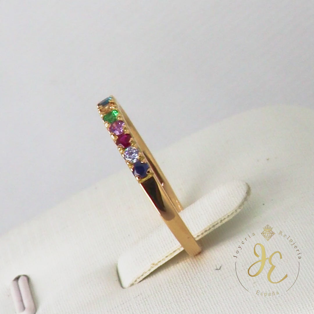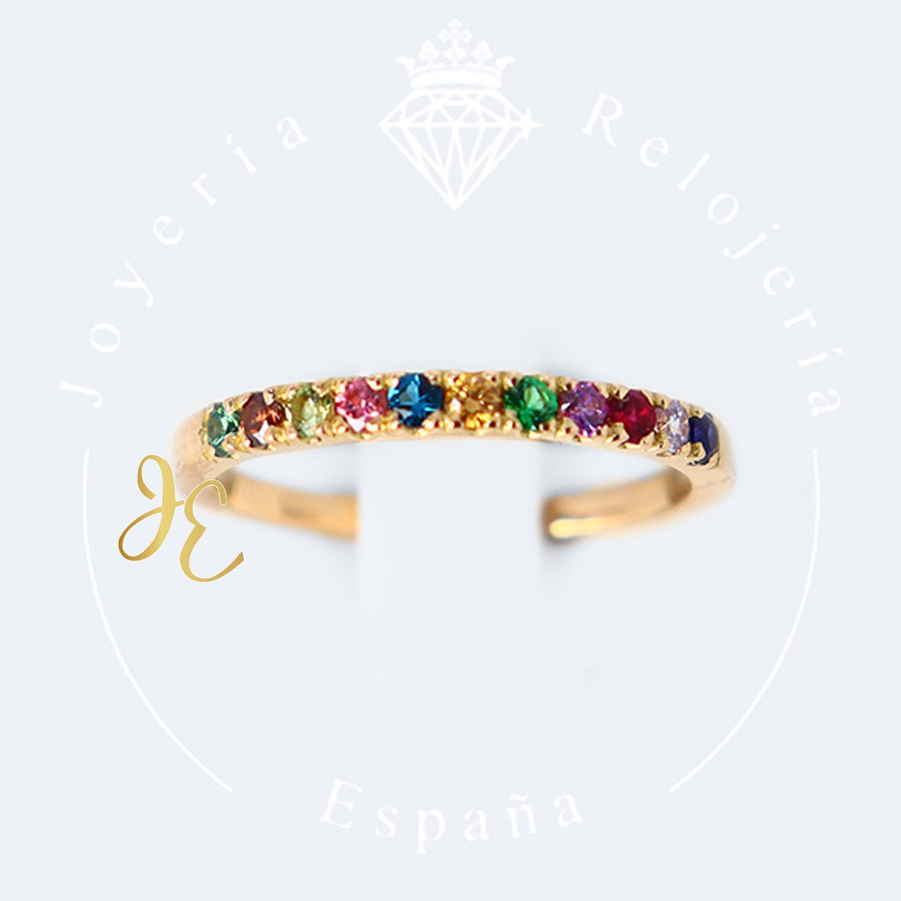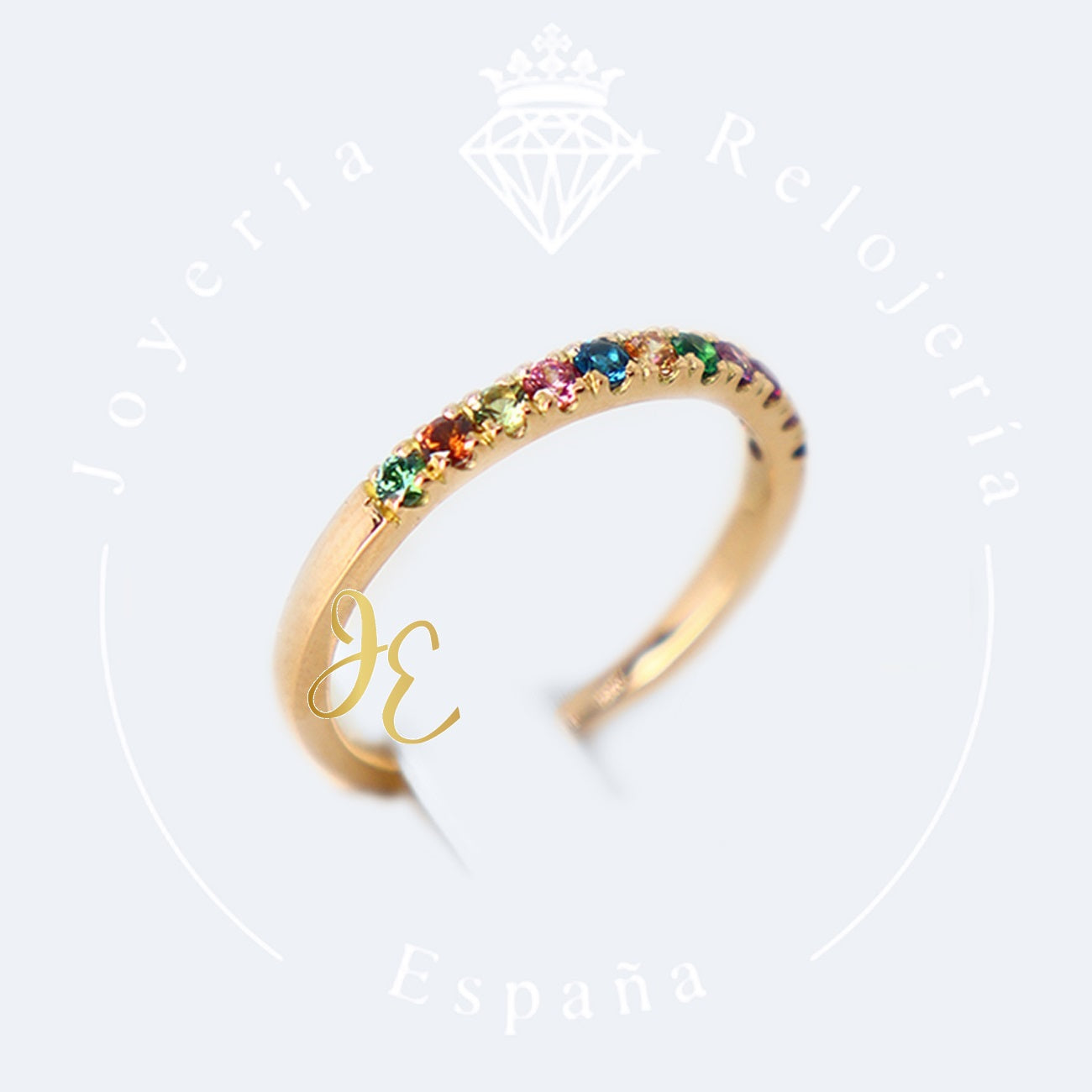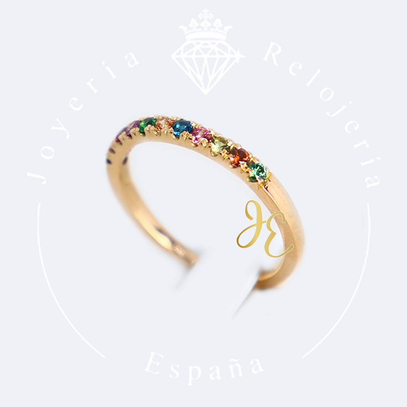 Sortija Fina y Elegante Modelo "Rokh" con Piedras Swarovski Multicolor de 1.75 mm. aprox. c/u. en oro clásico ley 18k legitimo está 1,240 soles.