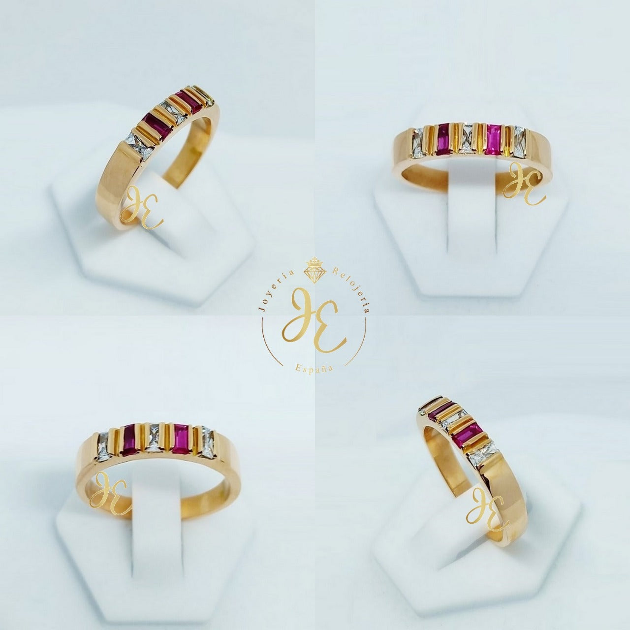 Sortija fina y elegante, Modelo "Elena" con Piedras Swarovski Corte Rectangular en oro clásico ley 18k legitimo está 2,580 soles.